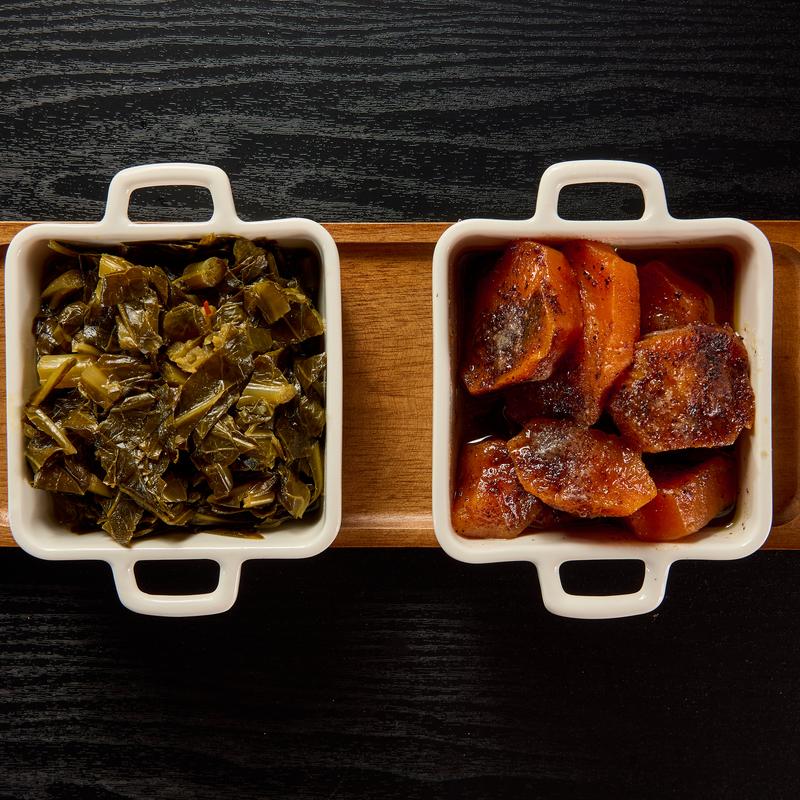 A cornbread bowl packed like a Sunday plate - creamy mac and cheese, candied yams, and tender greens all snuggled together, just like they would be on Grandma's table.