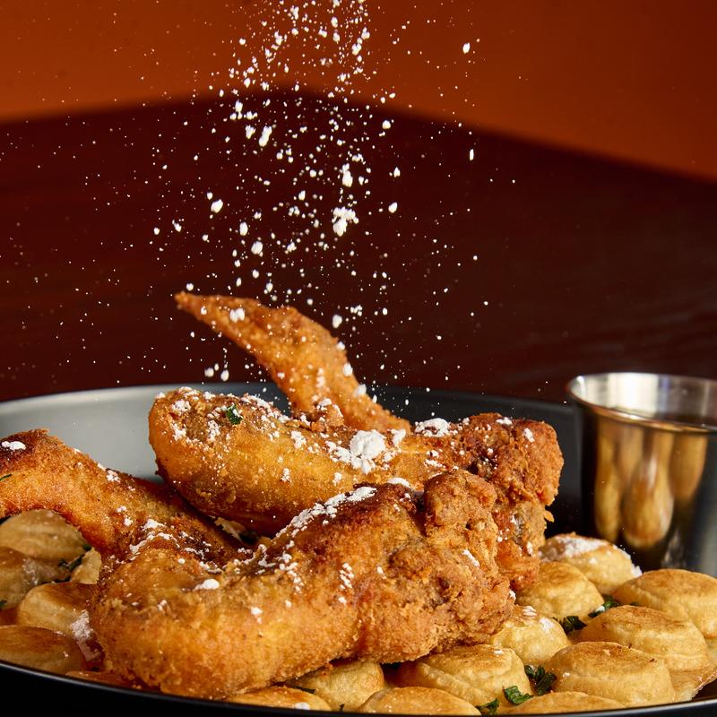 Golden fried chicken hugged up with a warm, buttery waffle, the kind of plate that makes you close your eyes after the first bite and just say, 'Good Googly Moogly'